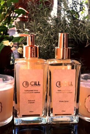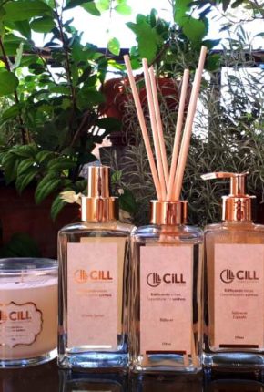 Produtos Exclusivos produzidos com a ID Olfativa CILL: aromatizador de ambientes, difusor de varetas, sabonete líquido com glitter dourado, fantásticas velas aromáticas – todos em rótulos hot stamping dourado, com o design exclusivo e artístico de Alex Mozdzenski, álcool gel em embalagem pocket, saneante multiuso com o cheiro da marca, entre outros.
